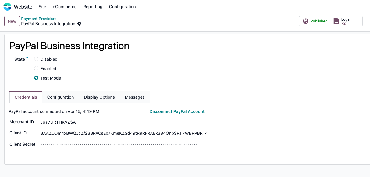After installing the modules, you need to connect your Odoo instance to your PayPal Business account.