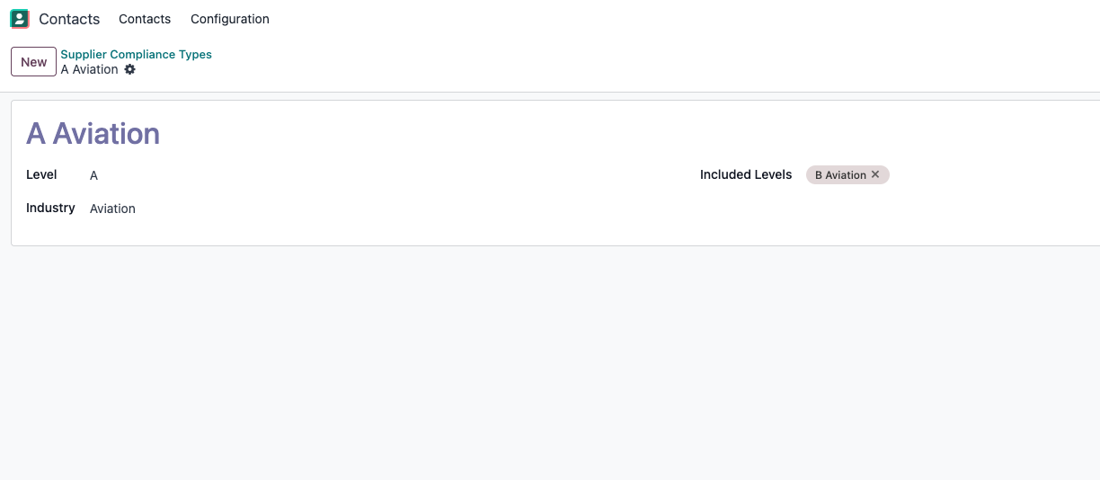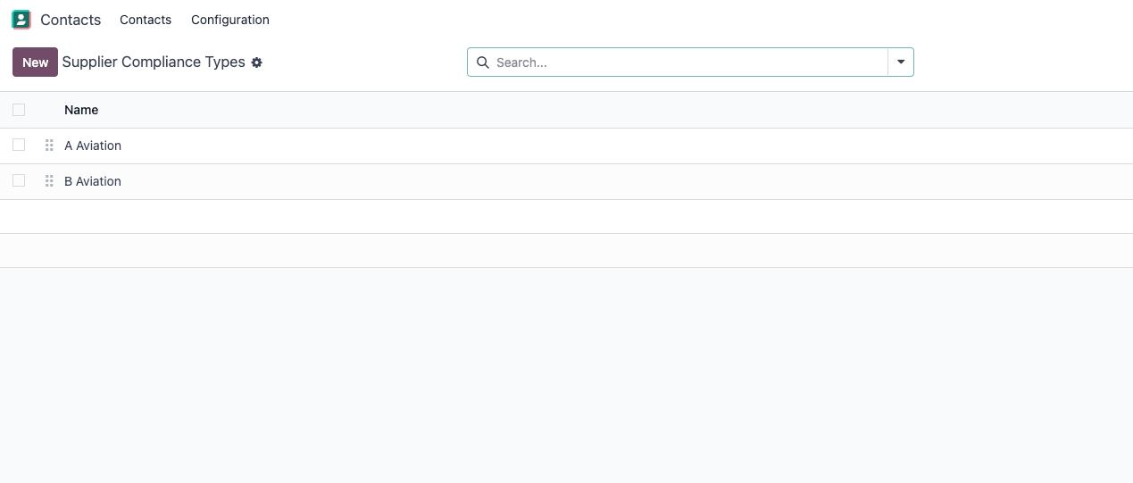 Navigate to Contacts > Configuration > Supplier Compliance Types.